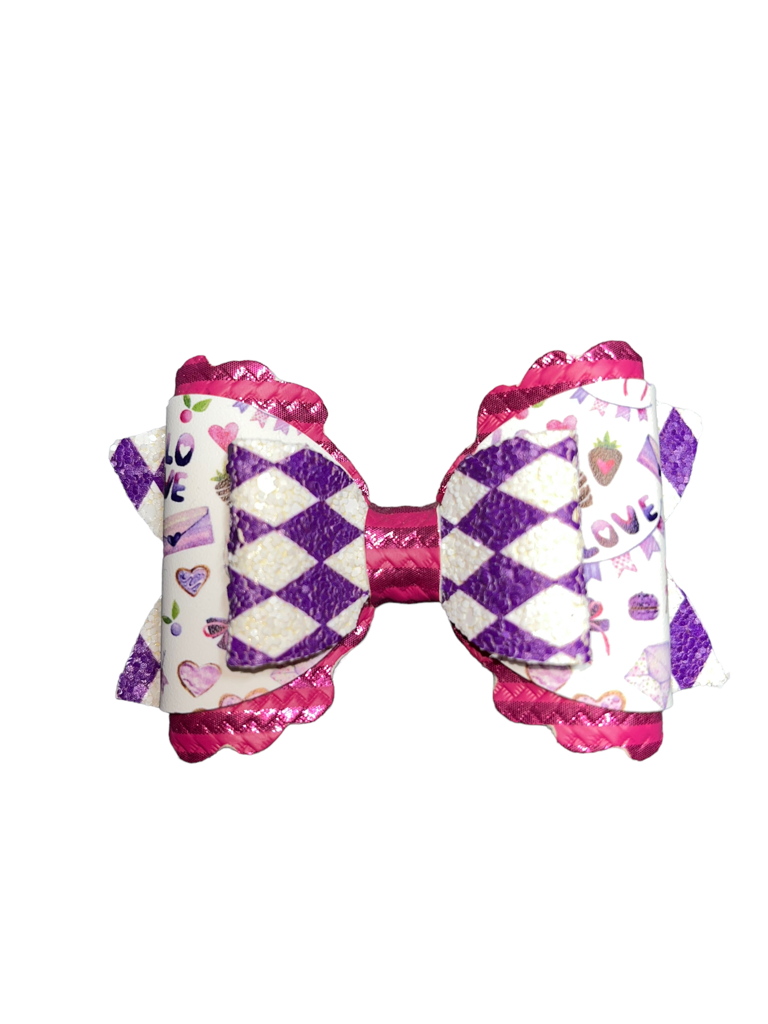 Beautiful handmade bow with white and purple diamonds shapes chunky glitter fabric with pink, purple and valentines things faux leather print.